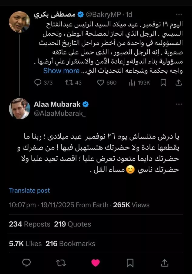 رد علاء مبارك على تدوينة للكاتب الصحفى والبرلمانى مصطفى بكرى على موقع اكس قائلا “يا درش متنساش يوم 26 نوفمبر عيدميلادي؛ ربنا ما يقطعها عادة ولا حضرتك هتستهبل فيها!
