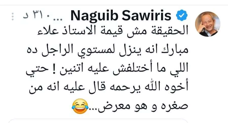 كتب ساويرس على حسابه: الحقيقة مش قيمة الاستاذ علاء مبارك إنه ينزل لمستوى الراجل ده اللى ما اختلفش عليه اتنين.. حتى أخوه الله يرحمه قال عليه انه من صغره وهو معرض