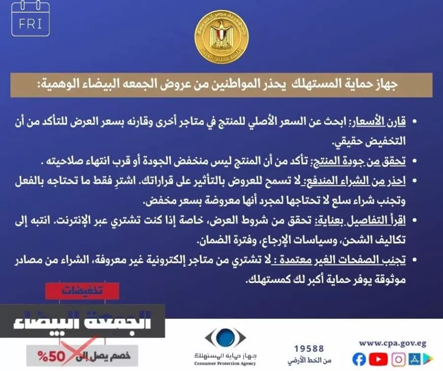 يُجدد جهاز حماية المستهلك دعوته للمواطنين بضرورة توخي الحذر عند التعامل مع عروض التخفيضات والمشتريات، سواء عبر المنصات الإلكترونية أو داخل المحال التجارية، وذلك حفاظًا على حقوقهم وضمانًا لشفافية المعاملات خلال موسم “الجمعة البيضاء”.