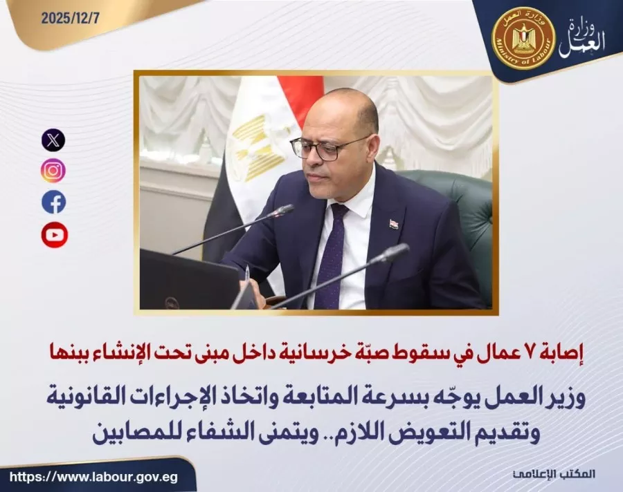 وجّه وزير العمل،  محمد جبران، مديريةَ عمل القليوبية بمتابعة حالات 7 عمال بمنطقة كفر الجزار بمدينة بنها بمحافظة القليوبية، بعد إصابتهم إثر سقوط صبّة خرسانية من الطابق الثالث داخل مبنى تحت الإنشاء، ما استدعى نقلهم فوراً إلى مستشفى التأمين الصحي ببنها لتلقي الإسعافات اللازمة.