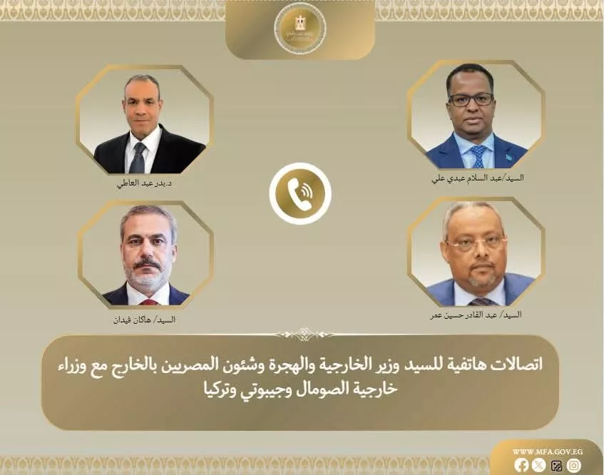 تلقى د. بدر عبد العاطي وزير الخارجية والهجرة وشئون المصريين بالخارج يوم الجمعة ٢٦ ديسمبر اتصالات هاتفية من كل من السيد عبد السلام عبدي علي وزير خارجية جمهورية الصومال، والسيد هاكان فيدان وزير خارجية تركيا، والسيد عبد القادر حسين عمر وزير خارجية جمهورية جيبوتي، حيث تناولت الاتصالات تطورات الأوضاع الخطيرة الأخيرة في منطقة القرن الأفريقي.