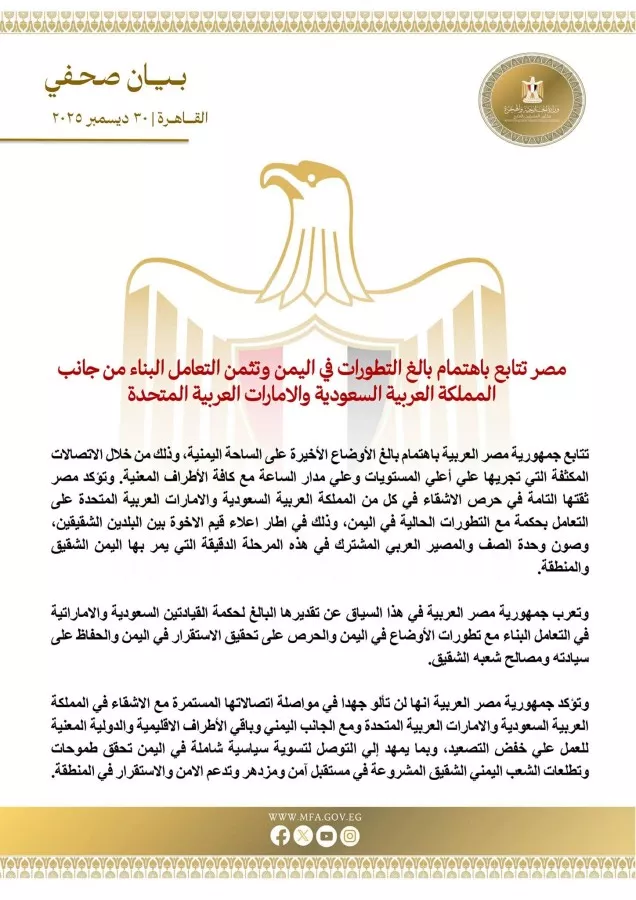 تتابع جمهورية مصر العربية باهتمام بالغ الأوضاع الأخيرة على الساحة اليمنية، وذلك من خلال الاتصالات المكثفة التي تجريها علي أعلي المستويات وعلي مدار الساعة مع كافة الأطراف المعنية. وتؤكد مصر ثقتها التامة في حرص الاشقاء في كل من المملكة العربية السعودية والامارات العربية المتحدة على التعامل بحكمة مع التطورات الحالية في اليمن، وذلك في اطار اعلاء قيم الاخوة بين البلدين الشقيقين، وصون وحدة الصف والمصير العربي المشترك في هذه المرحلة الدقيقة التي يمر بها اليمن الشقيق والمنطقة.