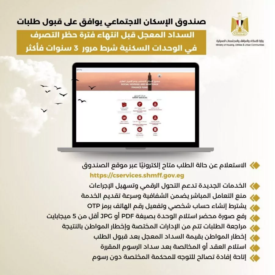 كما أكدت على أن جميع هذه الإجراءات يُشترط لتنفيذها قيام العميل بسداد كامل المستحقات الخاصة بالوحدة السكنية طرف جهة التمويل وتقديم إفادة مخالصة سداد كامل الثمن.