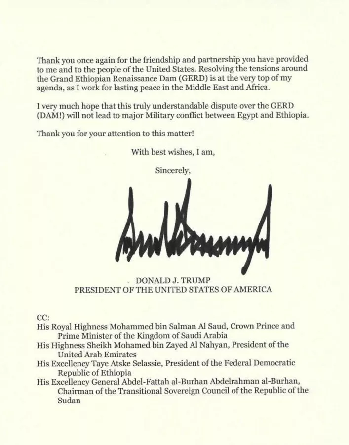 وقال الرئيس الأمريكي، في ختام رسالته، “أشكركم مرة أخرى على الصداقة والشراكة التي قدمتموها لي ولشعب الولايات المتحدة.. إن حل التوترات المحيطة بسد النهضة الإثيوبي الكبير (GERD) يأتي على رأس أولوياتي، بينما أعمل من أجل تحقيق سلام دائم في الشرق الأوسط وأفريقيا.. وآمل بشدة ألا يؤدي هذا النزاع المفهوم تمامًا بشأن سد النهضة (السد!) إلى صراع عسكري كبير بين مصر وإثيوبيا.. شكرًا لكم على اهتمامكم بهذا الأمر”.