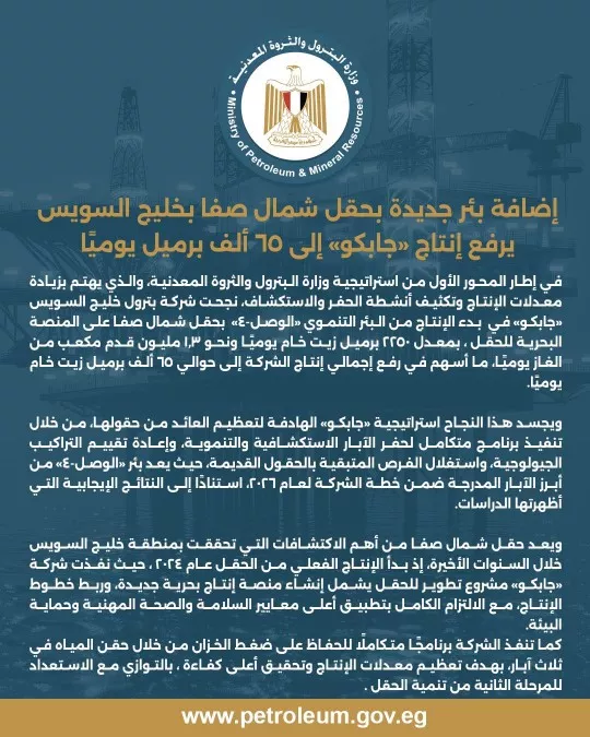 يعد حقل شمال صفا من أهم الاكتشافات التي تحققت بمنطقة خليج السويس خلال السنوات الأخيرة، إذ بدأ الإنتاج الفعلي من الحقل عام 2024 ، حيث نفذت شركة «جابكو» مشروع تطوير للحقل يشمل إنشاء منصة إنتاج بحرية جديدة، وربط خطوط الإنتاج، مع الالتزام الكامل بتطبيق أعلى معايير السلامة والصحة المهنية وحماية البيئة.