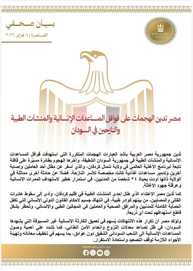 وتؤكد مصر أن تكرار هذه الانتهاكات يُسهم في تعميق الكارثة الإنسانية غير المسبوقة التي يشهدها السودان، في ظل تصاعد معدلات النزوح وانعدام الأمن الغذائي، كما تشدد علي أهمية وصول المساعدات الإنسانية الى الشعب السوداني الشقيق دون عوائق، بما يسهم في تخفيف معاناته وتهيئة الأجواء اللازمة لوقف التصعيد واستعادة الاستقرار.