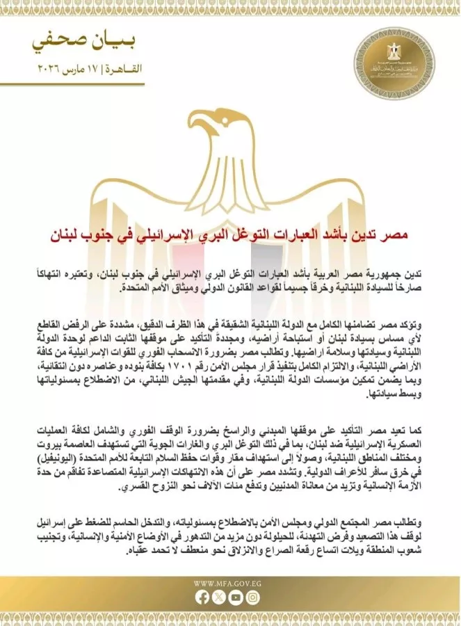 تدين جمهورية مصر العربية بأشد العبارات التوغل البري الإسرائيلي في جنوب لبنان، وتعتبره انتهاكاً صارخاً للسيادة اللبنانية وخرقاً جسيماً لقواعد القانون الدولي وميثاق الأمم المتحدة.