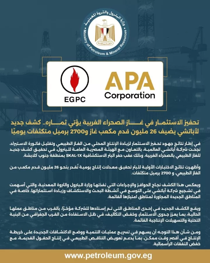 في إطار نتائج جهود تحفيز الاستثمار لزيادة الإنتاج المحلي من الغاز الطبيعي وتقليل فاتورة الاستيراد، نجحت شركة أباتشي العالمية، بالتعاون مع الهيئة المصرية العامة للبترول، في تحقيق كشف جديد للغاز الطبيعي بالصحراء الغربية، وذلك عقب حفر البئر الاستكشافية SKAL-1X بمنطقة جنوب كلابشة.