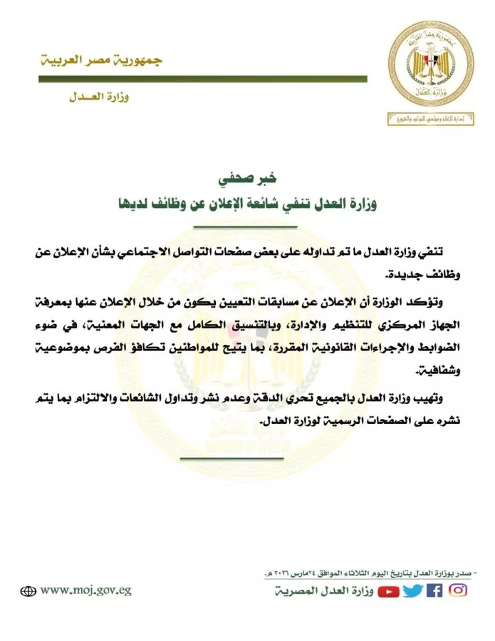 تنفي وزارة العدل ما تم تداوله على بعض صفحات التواصل الاجتماعي بشأن الإعلان عن وظائف جديدة.