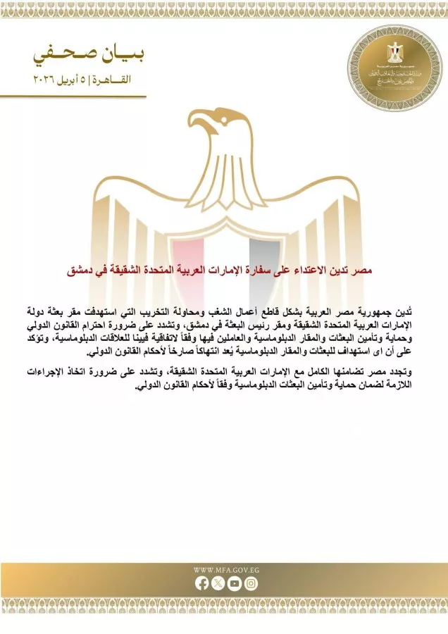 تُدين جمهورية مصر العربية بشكل قاطع أعمال الشغب ومحاولة التخريب التي استهدفت مقر بعثة دولة الإمارات العربية المتحدة الشقيقة ومقر رئيس البعثة في دمشق، وتشدد على ضرورة احترام القانون الدولي وحماية وتأمين البعثات والمقار الدبلوماسية والعاملين فيها وفقاً لاتفاقية فيينا للعلاقات الدبلوماسية، وتؤكد على أن اى استهداف للبعثات والمقار الدبلوماسية يُعد انتهاكاً صارخاً لأحكام القانون الدولي.