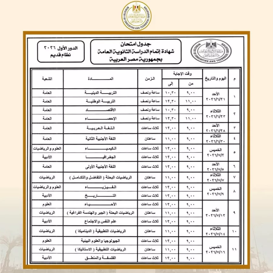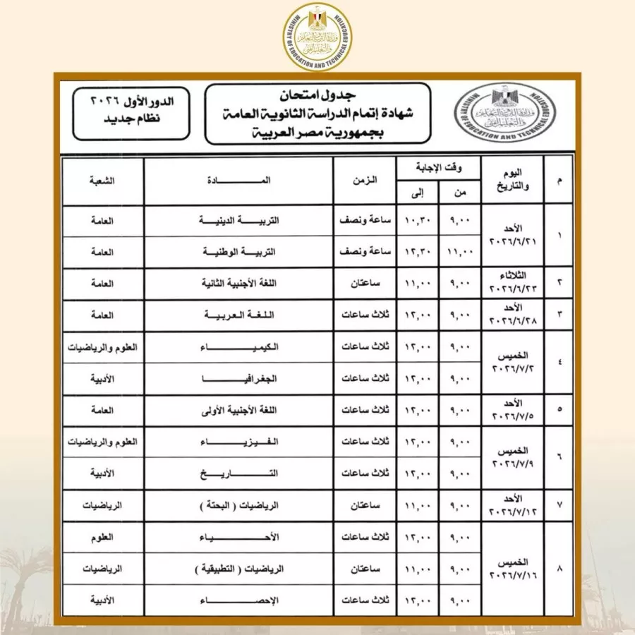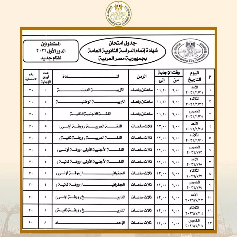 وبحسب جداول امتحانات الثانوية العامة، تبدأ امتحانات الثانوية العامة للدور الأول (نظام جديد – نظام قديم) والمكفوفين يوم الأحد الموافق 21 يونيو 2026، وتستمر حتى يوم الخميس 17 يوليو 2026.
