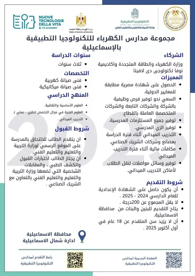 خطوات جديدة تخطوها وزارة التربية والتعليم والتعليم الفني تحت قيادة السيد محمد عبد اللطيف وزير التربية والتعليم والتعليم الفني، للتوسع في مدارس التكنولوجيا التطبيقية بمختلف تخصصاتها بالتعاون مع الوزارات والهيئات والمؤسسات الوطنية والدولية، بما يفتح أمام الطلاب آفاقًا واسعة لاكتساب مهارات عملية متقدمة تواكب احتياجات سوق العمل، حيث تعلن الوزارة من خلال وحدة تشغيل وإدارة مدارس التكنولوجيا التطبيقية، عن إضافة مدارس جديدة في قطاع الكهرباء،