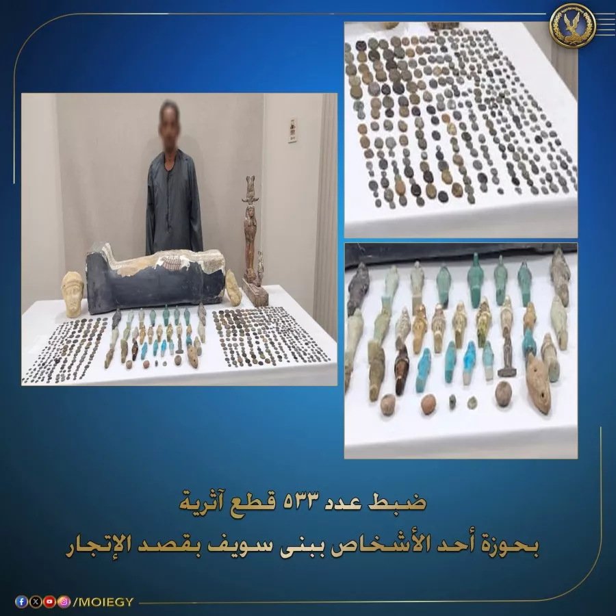 عقب تقنين الإجراءات أمكن ضبطه وبحوزته (533 قطعة أثرية “تماثيل ، تمائم ، عملات معدنية”) وبمواجهته إعترف بحيازتها بقصد الإتجار بها، وأضاف بتحصله عليها من أعمال الحفر والتنقيب غير المشروع عن الآثار بأحد المناطق الكائنة بدائرة مركز شرطة ببا ببنى سويف.. وبعرض القطع المضبوطة على الجهات المختصة أفادت بكونها آثرية تعود لعصور قديمة فيما عدا عدد محدود منها يشتبه فى أثريته.