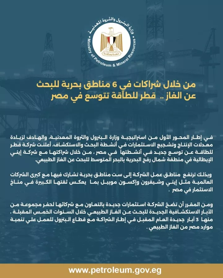 في إطار المحور الأول من استراتيجية وزارة البترول والثروة المعدنية، والهادف لزيادة معدلات الإنتاج وتشجيع الاستثمارات في أنشطة البحث والاستكشاف، أعلنت شركة قطر للطاقة عن توسع جديد في أنشطتها في مصر ، من خلال شراكتها مع شركة إيني الإيطالية في منطقة شمال رفح البحرية بالبحر المتوسط للبحث عن الغاز الطبيعي.