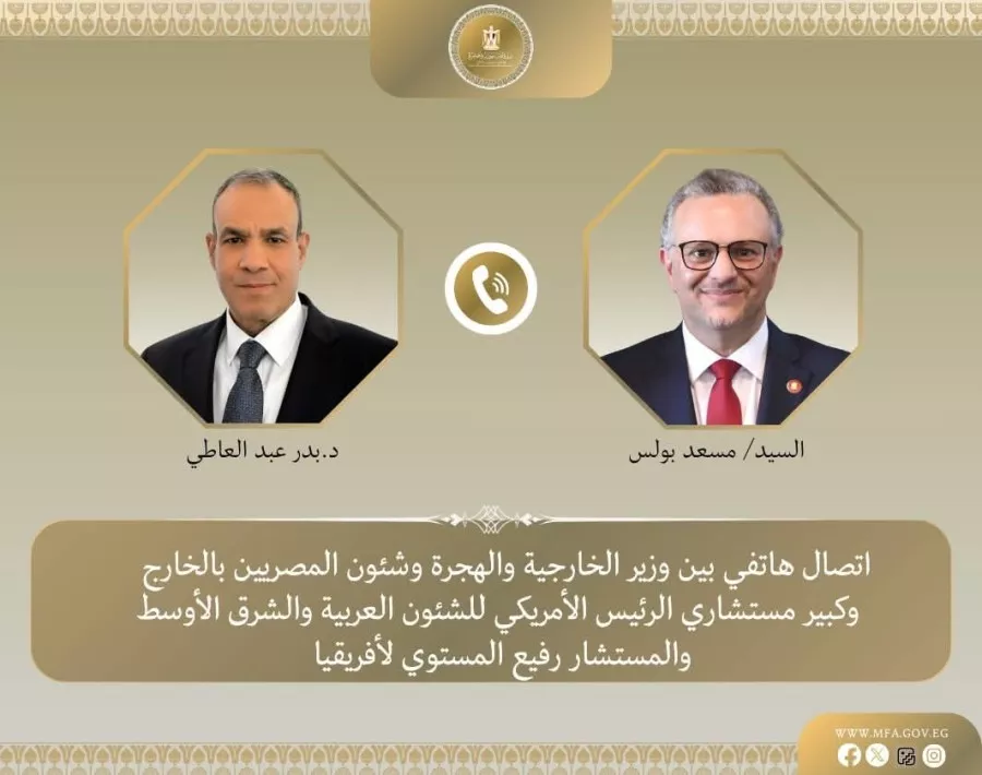 جرى اتصال هاتفي أمس ٢٧ اكتوبر بين د. بدر عبد العاطي وزير الخارجية والهجرة وشئون المصريين بالخارج مع السيد مسعد بولس، كبير مستشاري الرئيس الأمريكي للشئون العربية والشرق الأوسط والمستشار رفيع المستوي للشئون الأفريقية، وذلك لبحث تطورات الأوضاع في كل من السودان وليبيا.