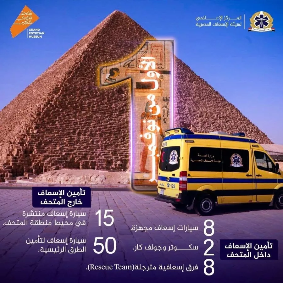 • 50 سيارة إسعاف إضافية لتأمين الطرق والمحاور الرئيسية المؤدية إلى المتحف